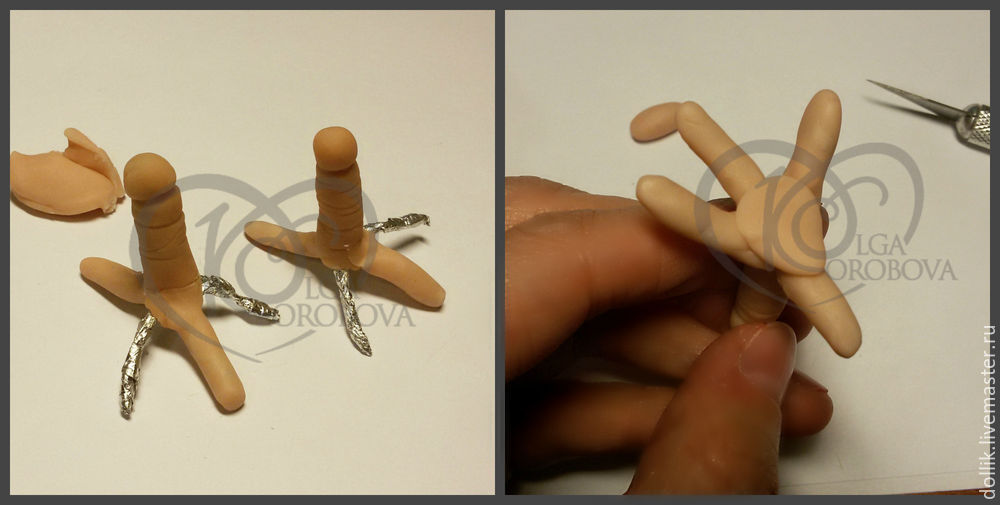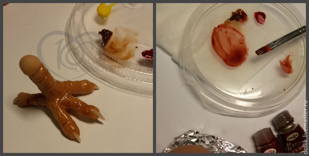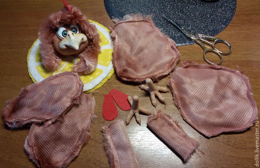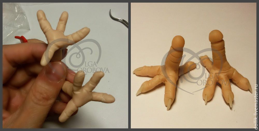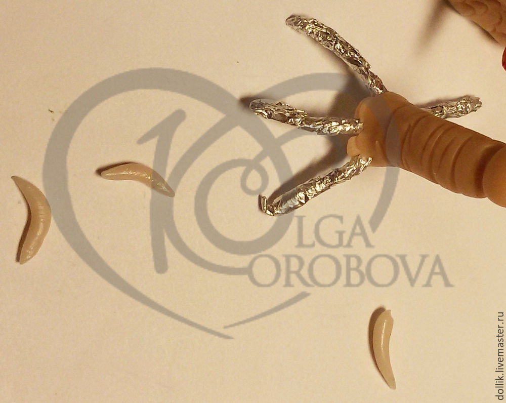 Коготки делаем из жгутика белого цернита, нарезая его на отрезки и заостряя один конец. Теперь берем пластик, хорошо разминаем его до эластичной массы и накладываем на лапки. Соединяем швы, делаем характерные складочки, имитируя куриные лапки, и убираем лишнюю часть проволоки. Вверху лапки примазываем шарик, тщательно соединяя его с ножкой. Делаем углубление для соединения с тканью и ставим в духовку на подзапек — около 15 минут при t 110.