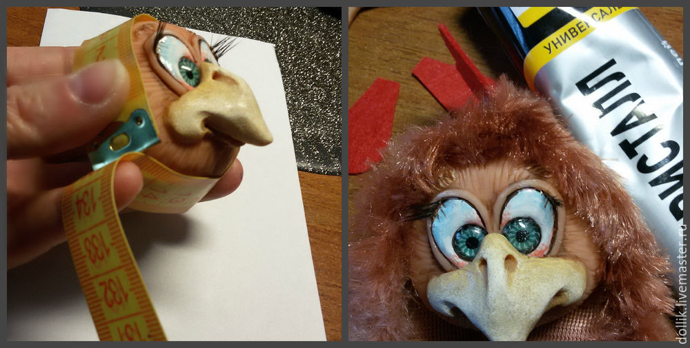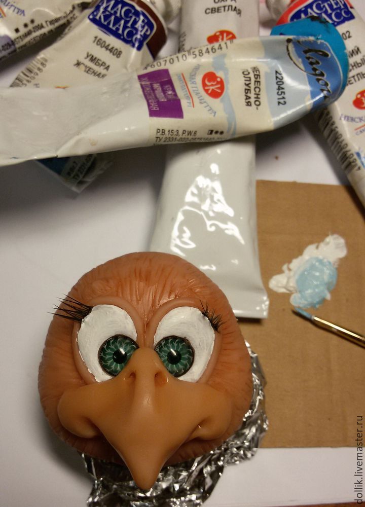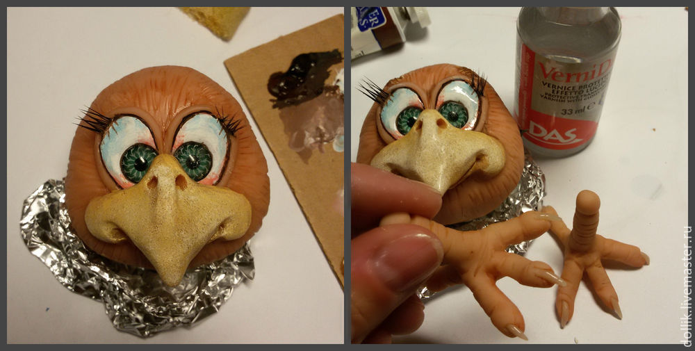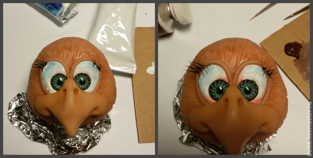 Оформляем темным акрилом линию вокруг глаз, рисуем небольшие полоски-«тени» на белке под ресницами. Клюв расписываем также акрилом, смешав белый и охру. Для равномерного окрашивания, без разводов кисточки, я тонировала клювик подушечкой пальца, краска при этом должна быть слегка густовата. Слегка пройдемся по бровкам, немного выделив их другим тоном. Белки глаз и коготки покрываем глянцевым лаком.