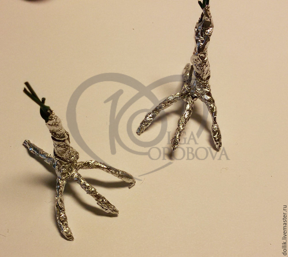 Далее берем фольгу, нарываем на небольшие отрезки, слегка сминаем ее и аккуратно накручиваем на ножки, одновременно обвивая пальчики лапки. Не надо растягивать фольгу — она порвется, просто накидывайте ее на детали и приминайте, продвигаясь вперед. На концах пальчиков рекомендую сделать небольшую подушечку, чтобы спрятать острые концы проволоки.