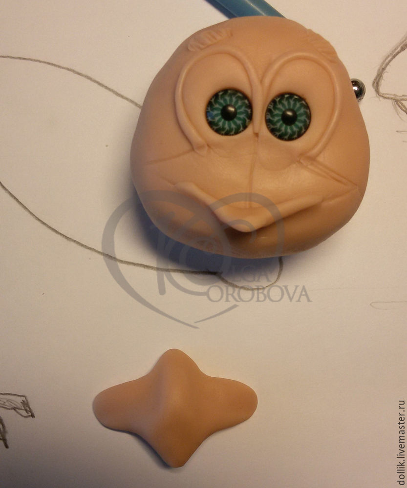 Делаем из лепешки толщиной 5 мм основу для мордочки. Хорошо примазываем к заготовке из фольги и делаем разметку посередине для симметрии. Намечаем глазки и клюв.