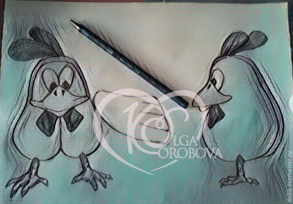 Для работы понадобится: эскиз будущего петушка, флористическая проволока, фольга, запекаемый пластик — я использовала «Super Sculpey», кусочек белого цернита, 2 бусины на ножке или зрачки от пластиковых глазок, какие использовала я, акриловые и масляные краски, разбавитель «Пинен» или любой другой разбавитель для масляных красок, клей «Момент Кристалл», глянцевый лак VERNIDAS или прозрачный лак для ногтей, плоскогубцы-кусачки, инструменты для лепки, ватные диски, нитки-иголки, ножницы, любой утяжелитель (металлический гранулят, камушки, прокаленная гречка или другая крупа), реснички, мех или любой другой материал для тушки на ваше усмотрение и возможности. Для начала я нарисовала эскиз петушка, его приблизительные размеры, на которые потом ориентировалась в процессе работы. Возможно, вид петушка изменится после того, как вы слепите мордочку — мой, например, захотел стать длиннее, а не как задумала сразу — мультяшным шариком. Всё в ваших руках!