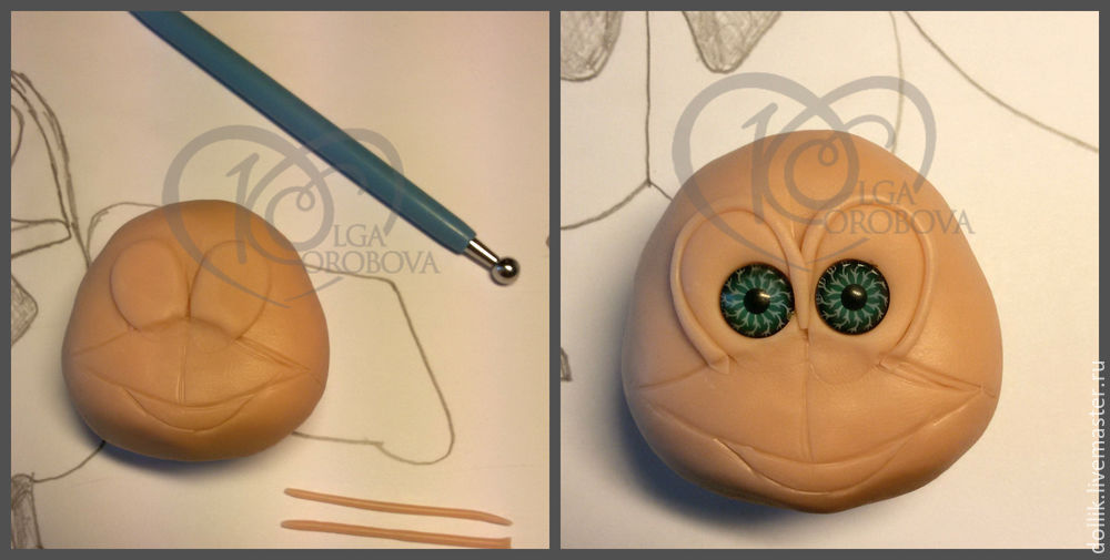 Их двух одинаковых овальных блинчиков лепим глазки — прикрепляем их к размеченным формам и аккуратно примазываем.