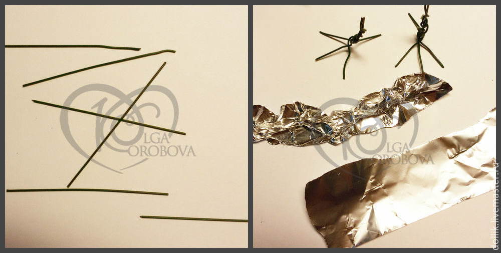 Вначале я решила сделать лапки с острыми коготками. Для этого нарезала флористической проволоки, сложила по 4 и скрутила в одно целое, расставив пальцы — 3 вперед и 1 назад.