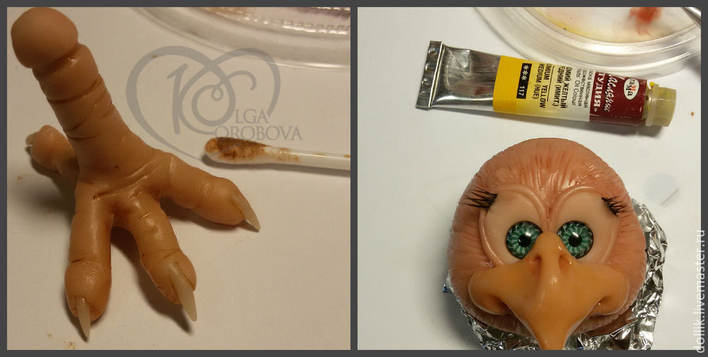 Далее тут же ватным диском и ватными палочками снимаем лишний слой. В складочках останется краска, придавая глубину и объем деталям. Если вы намазали слишком много, вы всегда сможете убрать лишнюю краску при помощи разбавителя. Клюв тонируем желтоватой краской и ставим детали в духовку, чтобы масляная краска подсохла и не блестела. Я ставила на 15 минут.