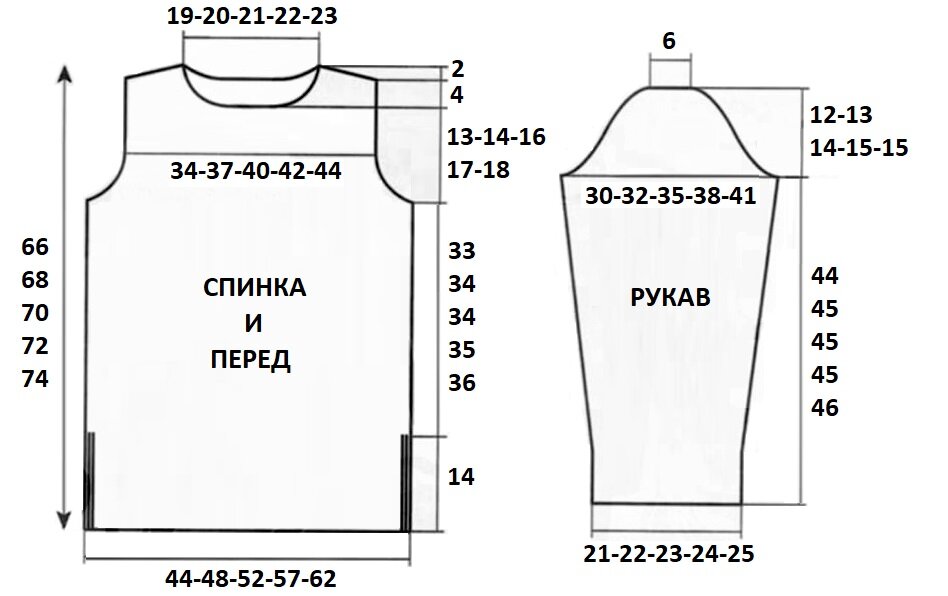 Горловина: На высоте 60-62-64-66-68 см (= 120-124-128-132-136 р.) от начала закрыть центральные 24-26-26-28-30 п., затем продолжить каждую сторону раздельно, закрывая со стороны горловины в каждом 2 р. 1 раз по 3 п., 1 раз по 2 п., 1 раз по 1 п.