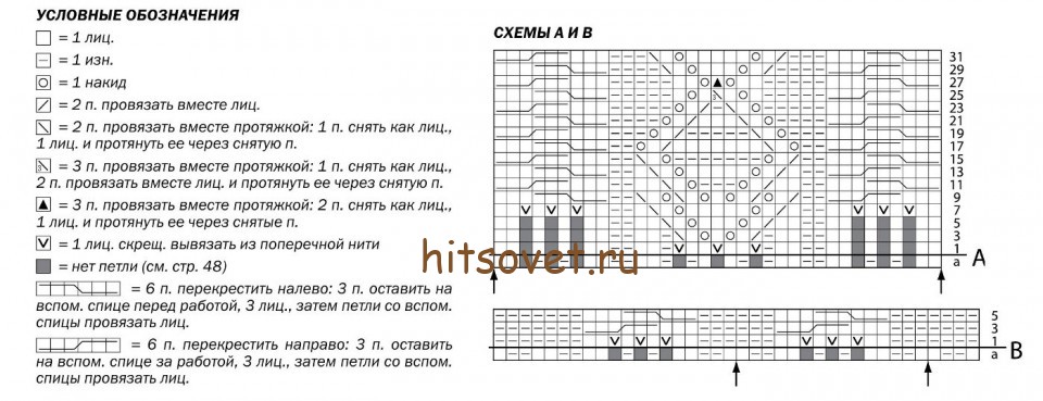 Узор с косами для рукавов: вязать, как ажурный узор с косами, но по схеме В. В 1-м ряду прибавить в каждом раппорте 3 петли. Начинать с 0 (2, 4) петель до 1-й стрелки, повторять 15 петель раппорта, заканчивать 15 (17, 19) петель после 2-й стрелки.