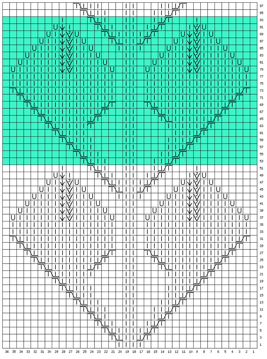 Начинаем вязать с первого ряда, раппорт листьев – 34 петли + две изнаночные по краям. Вяжем с 1 по 94 ряд, затем повторяем раппорт с 53 по 94 ряд (выделен зеленым цветом).