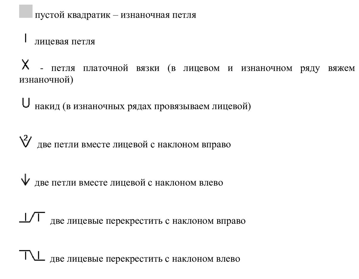Составила схему вязания листьев для лицевых рядов, в изнаночных рядах все петли вяжем по рисунку, накиды – лицевыми.