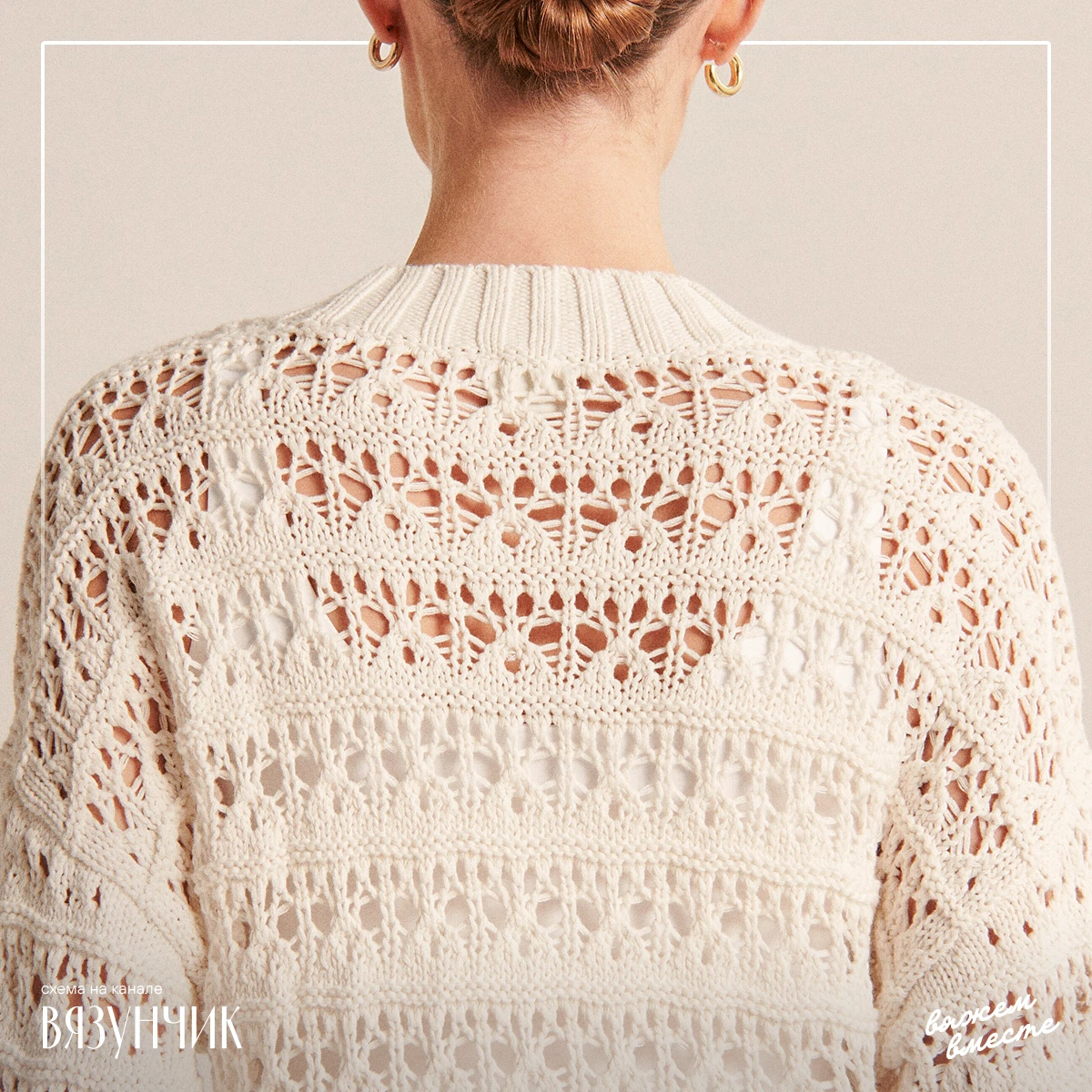 Узор довольно простой, но при вязании спицами придётся пользоваться разными хитростями. Например, вместо двух сбрасываемых накидов подряд оставить только один, а второй заменить на ручную протяжку. Так отверстия получатся менее крупными, более похожими на оригинальный вариант, связанный на машине.
