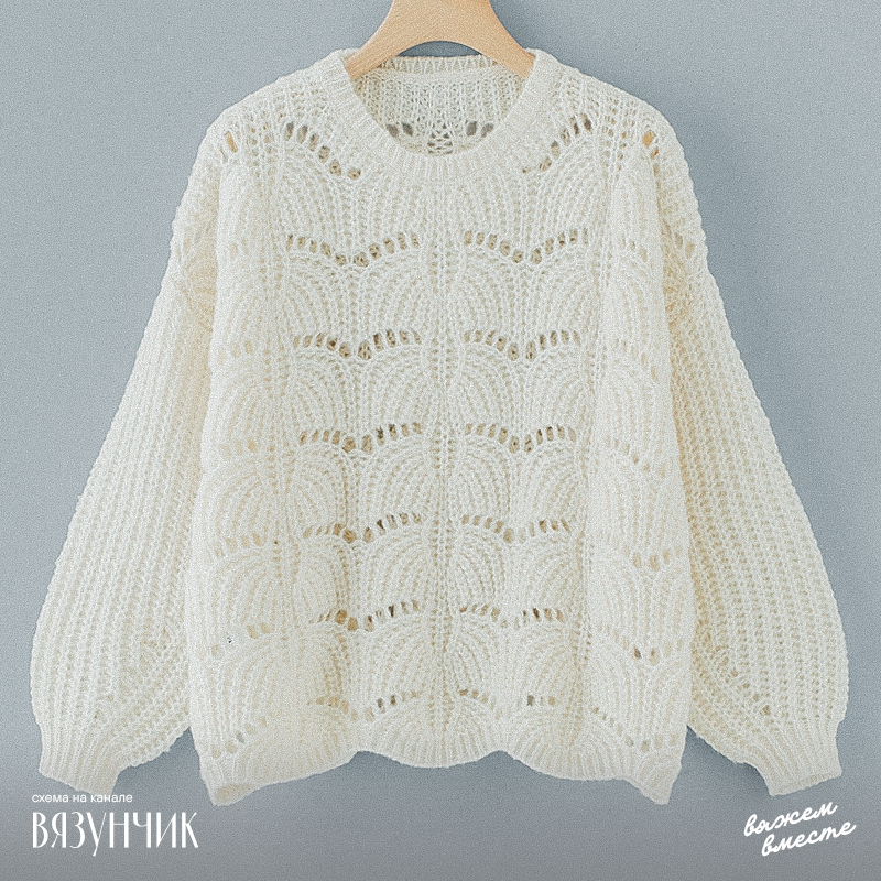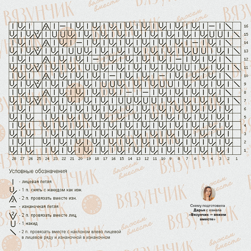 Высота раппорта регулируется с 1 по 6 ряды. Т. е. при желании свяжите больше таких рядов или меньше. Выше идут накиды, которые и образуют ажур. На схеме лицевые и изнаночные ряды.