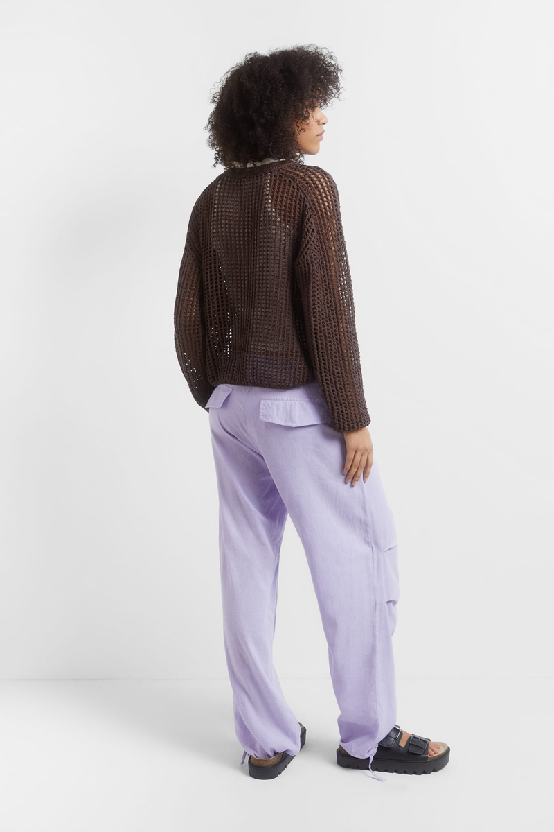 На этой фотографии видно узор крупным планом, это прозрачная квадратная сетка. Планка ворота связана лицевой гладью, а ворот – резинка 1х1.