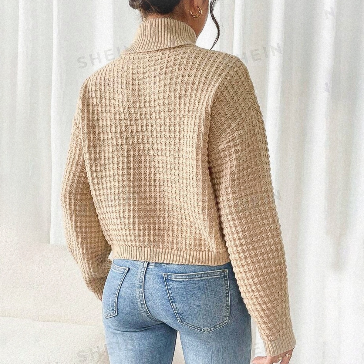 Рельефные соты — это классический узор, который всегда смотрится выигрышно, особенно если вязать его упругой, но мягкой пряжей. В данном случае свитер выполнен в бежевом цвете, что делает его универсальным. В сочетании с рельефными сотами используется простой вафельный узор по верху переда, на спинке и на рукавах.