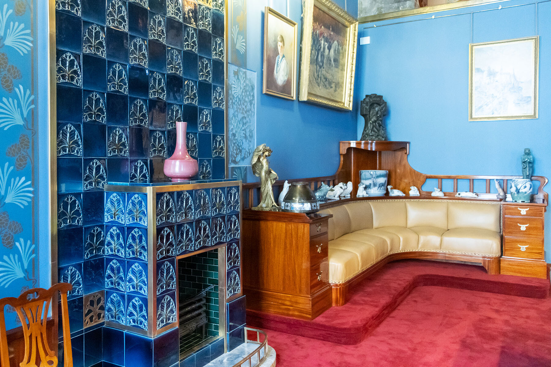 Отреставрированный камин с синими рельефными изразцами. Стены расписаны трафаретным орнаментом вокруг кафельной облицовки камина и арки в стене.