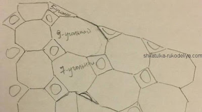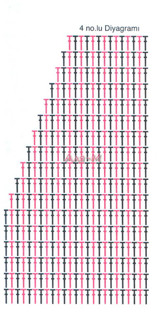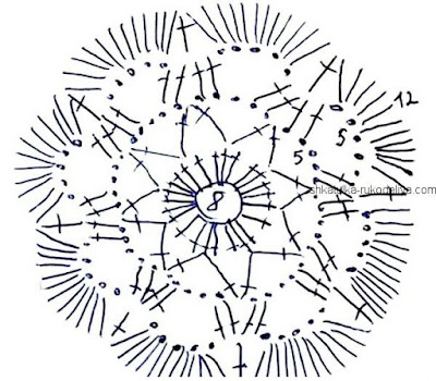 1 ðÿä. Íàáèðàåì 36 âï, âÿæåì â 5þ ïåòëþ îò êðþ÷êà 3ÑÍ â îäíó ïåòëþ, ïðîïóñêàåì 2 ÂÏ è â ñëåäóþùóþ âÿæåì 3ÑÍ â îäíó ïåòëþ, äàëåå ïðîïóñêàåì 2 ÂÏ è â ñëåäóþùóþ âÿæåì 3ÑÍ+3ÂÏ+3ÑÍ â îäíó ïåòëþ. Ïîëó÷èëàñü ïåðâàÿ âåðøèíà. Ïðîïóñêàåì 2 ÂÏ è â ñëåäóþùóþ 3ÑÍ â îäíó ïåòëþ, ïðîïóñêàåì 5 ÂÏ è â ñëåäóþùóþ 3ÑÍ â îäíó ïåòëþ, ïîëó÷èëàñü âòîðàÿ âåðøèíà. Äàëåå àíàëîãè÷íî 2ÂÏ ïðîïóñêàåì 3ÑÍ â îäíó ïåòëþ.