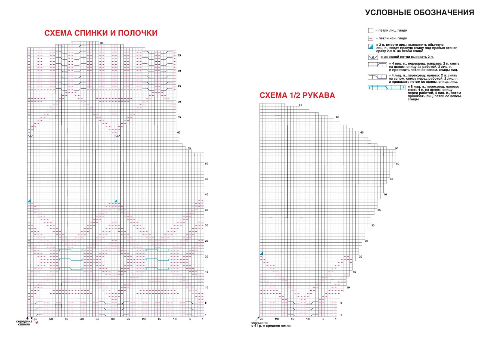 Рельефный узор: вязать по схеме, на которой приведены левая полочка без планки и без убавлений для выреза горловины, половина спинки, а также половина рукава без кромочной петли. Вторые половинки и правую полочку вязать в зеркальном отображении, т. е. по схеме слева направо.