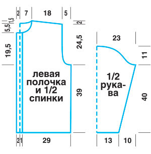 На высоте 39 см от начала работы для формирования проймы закрыть справа сначала 4 п., затем в каждом р. 1 х 2 п., 2 х 1 п., во 2-м р. 1 х 1 п., получим на спицах 54 п. На высоте 19,5 см от начала проймы для формирования выреза горловины закрыть с левой стороны в каждом 2-м р. 1 х 9 п., 1 х 4 п., 2 х 2 п., в каждом 4-м р. 1 х 2 п. и 1 х 1 п. На высоте 24,5 см от начала проймы для формирования скоса плеча закрыть в каждом р. 1 х 10 п., 1 х 7 п., 1 х 8 п., 1 х 9 п. На высоте 26,5 см от начала проймы все петли должны быть закрыты.