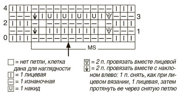 Узор начать с 1 изнаночного ряда (= ряд 0 схемы). Затем 1–4-й р. постоянно повторять. 1-й изнаночный ряд не учитывать в последующих расчетах.