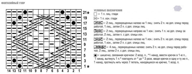 Плотность вязания. Совокупность узоров: 20 п. и 22 р. = 10 х 10 см. Фантазийный узор: 14 п. = 7 см.