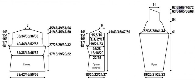 Спинка: набрать 76/84/92/100/112 п., связать 1 р. лиц. п. и вязать следующим образом 1 кром., 4 лиц., перекрещенных направо, 8/12/16/20/26 п. жемчужным узором, 2 лиц., перекрещенных направо, 2 лиц., перекрещенных налево, 14 л. фантазийным узором, 2 лиц., перекрещенных направо, 2 лиц., перекрещенных налево, 6 п. жемчужным узором, 2 лиц., перекрещенных направо, 2 лиц., перекрещенных налево, 14 п. фантазийным узором, 2 лиц., перекрещенных направо, 2 лиц., перекрещенных налево, 8/12/16/20/26 п. жемчужным узором, 4 лиц., перекрещенных налево, 1 кром. Одновременно убавить на расстоянии 5 п. от края 3 х 1 п. в каждом 10-м р., 1 х 1 п. в каждом 8-м р./4 х 1 п. в каждом 10-м р./1 х 1 п. в каждом 12-м р., 3 х 1 п. в каждом 10-м р./2 х 1 п. в каждом 12-м р., 2 х 1 п. в каждом 10-м р./4 х 1 п. в каждом 12-м р. = 68/76/84/92/104 п. Через 17/18/19/20/22 см от наборного края прибавить с обеих расстоянии 5 п. от края (прибавление в полотне) 1 х 1 п. в каждом 4-м р., 5 х 1 п. в каждом 2-м р. = 80/88/96/104/116 п. Через 27/28/29/30/32 см от наборного края для пройм закрыть с обеих сторон в каждом 2-м р. 1 х 3 п., 1 х 2 п., 2 х 1 п./1 х 3 п., 3 х 2 п.,1 х 1 п./1 х 3 п., 4 х 2 п., 2 х 1 п./1 х 4 п., 1 х 3 п., 3 х 2 п. 3 х 1 п./1 х 4 п., 2 х 3 п., 3 х 2 п., 4 х 1 п. = 66/68/70/72/76 п. Через 41/43/45/47/50 см от наборного края для скосов плеч закрыть с обеих сторон в каждом 2-м р. 3 х 7 п., 1 х 6 п./4 х 7 п./1 х 8 п., 3 х 7 п./2 х 8 п., 2 х 7 п./4 х 8 п., закрыть оставшиеся 12 п. горловины.