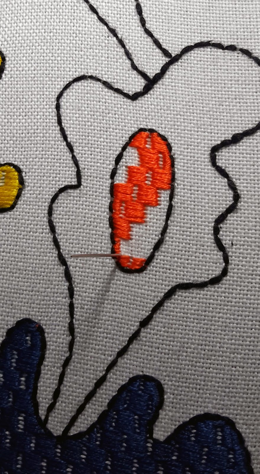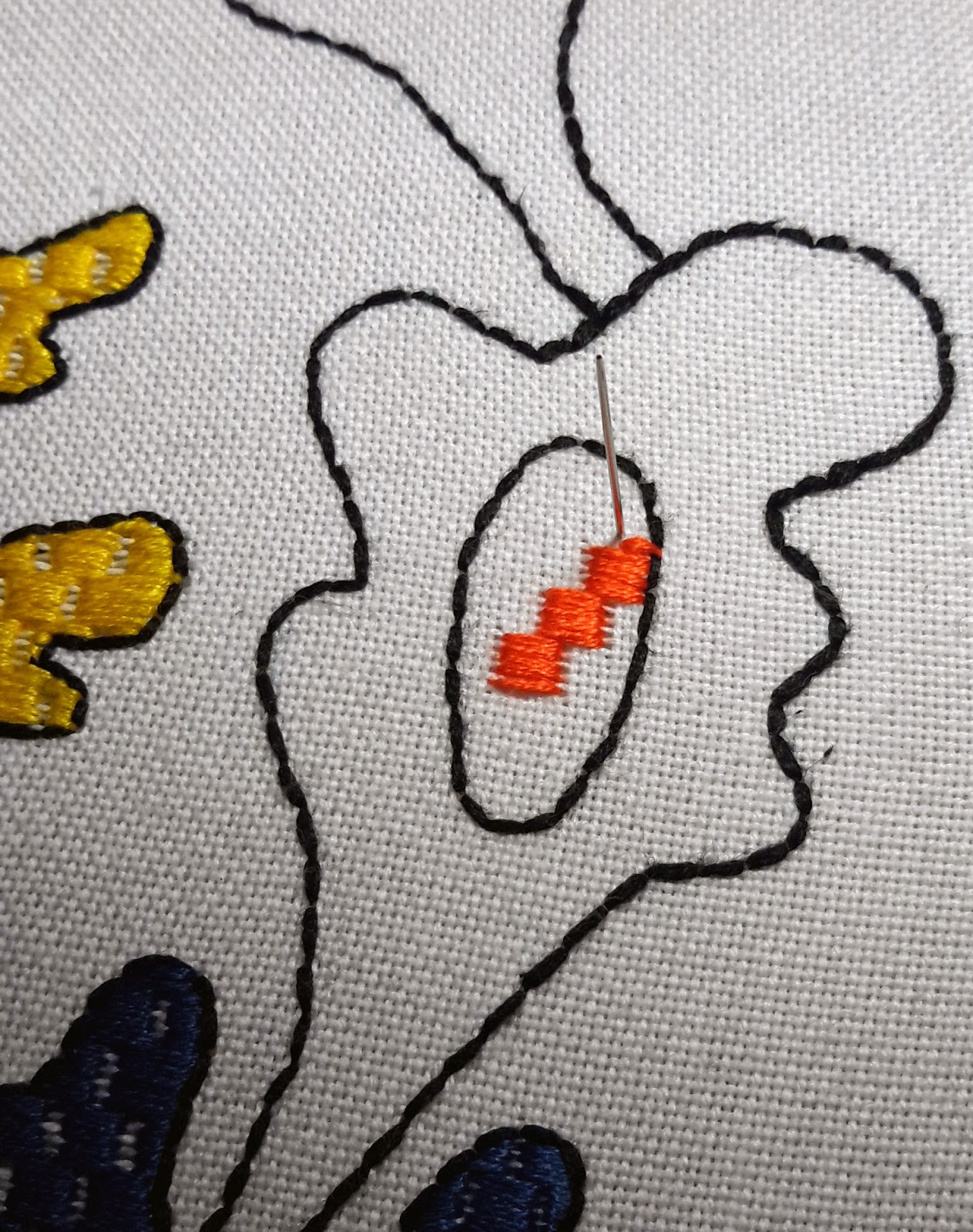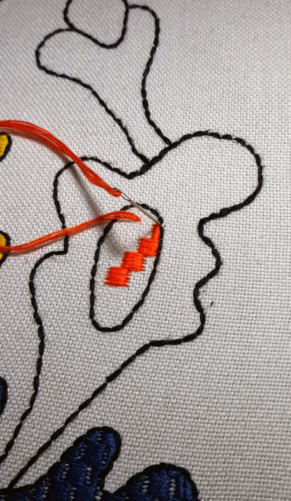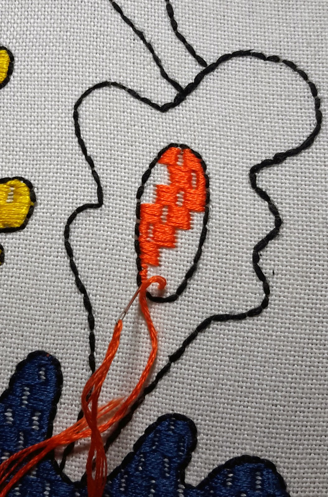 Теперь третий: мы видим,что третий кирпичик у нас возле контура,поэтому аккуратно его правую сторону заводим под черную нитку: