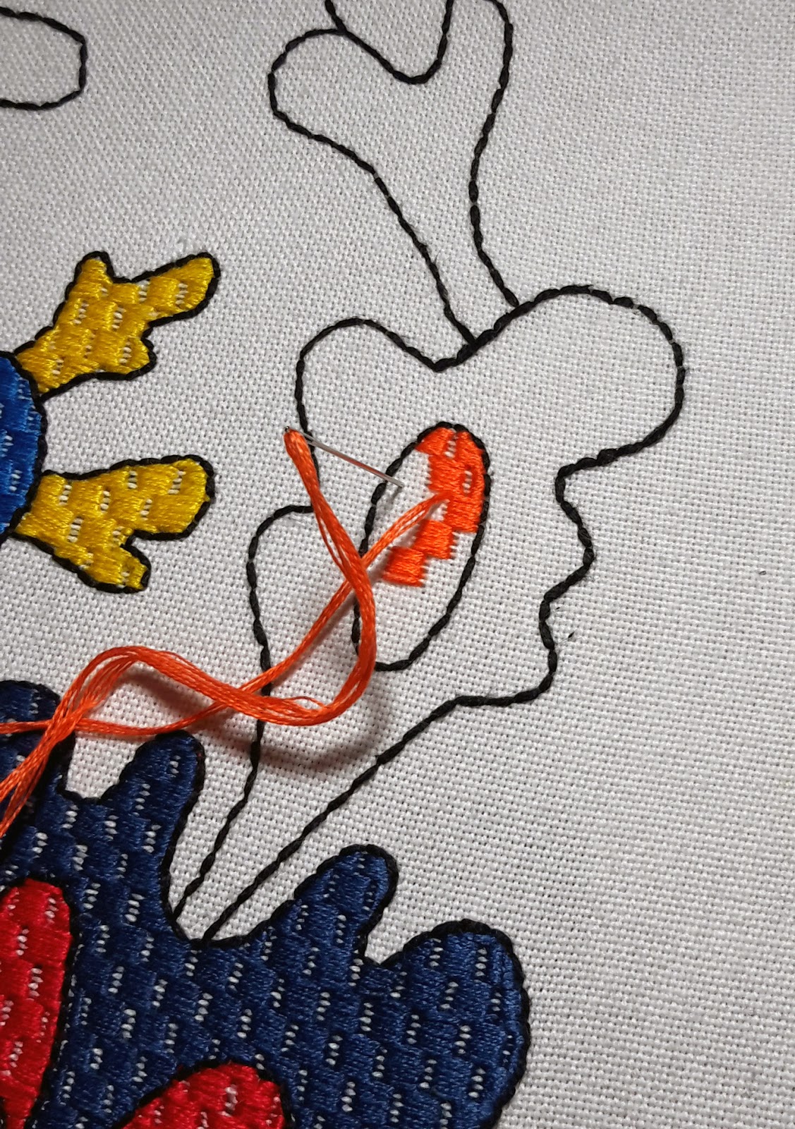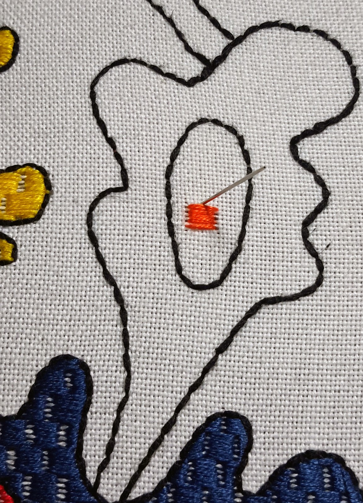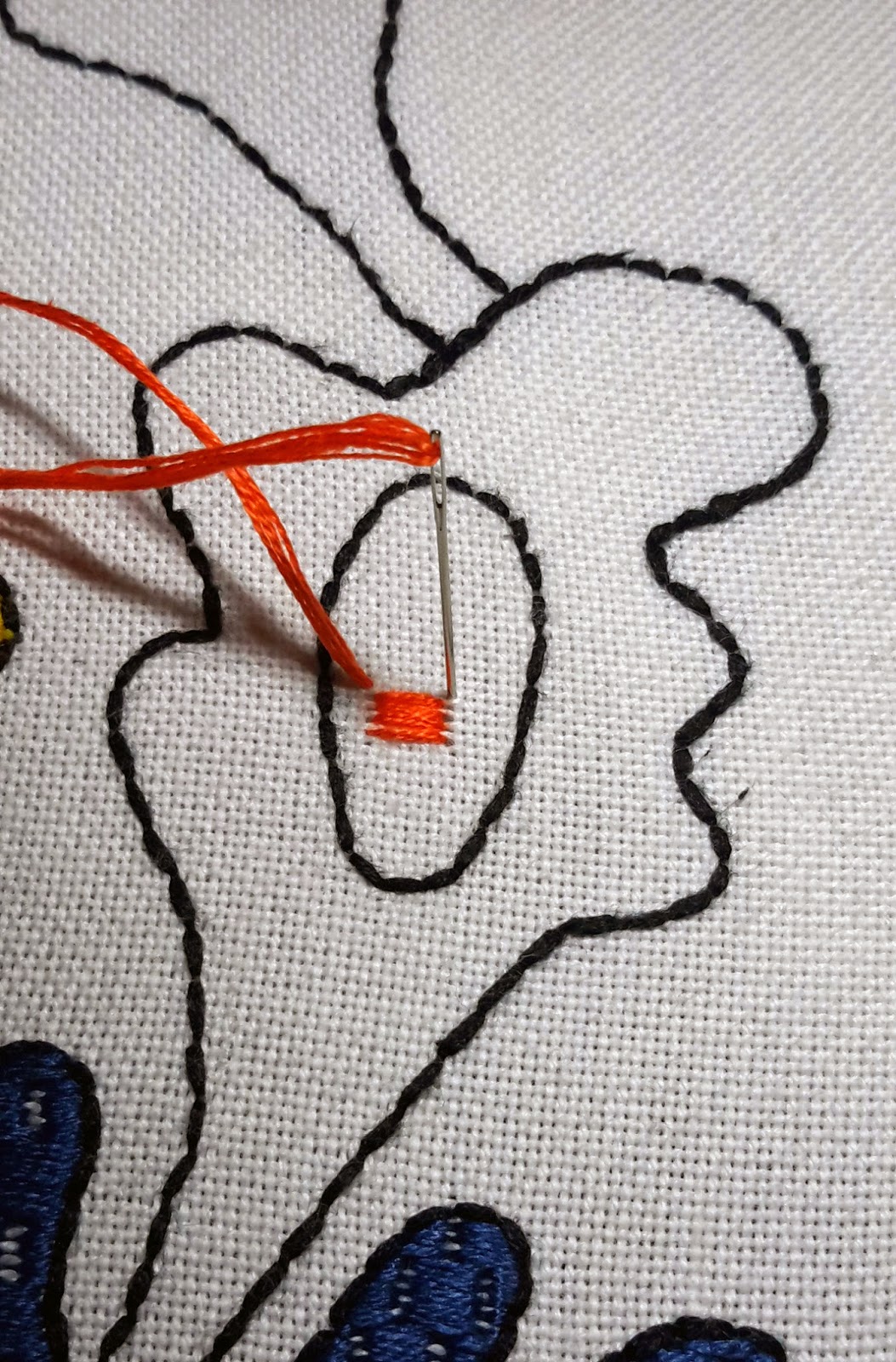 Теперь третий: мы видим,что третий кирпичик у нас возле контура,поэтому аккуратно его правую сторону заводим под черную нитку: