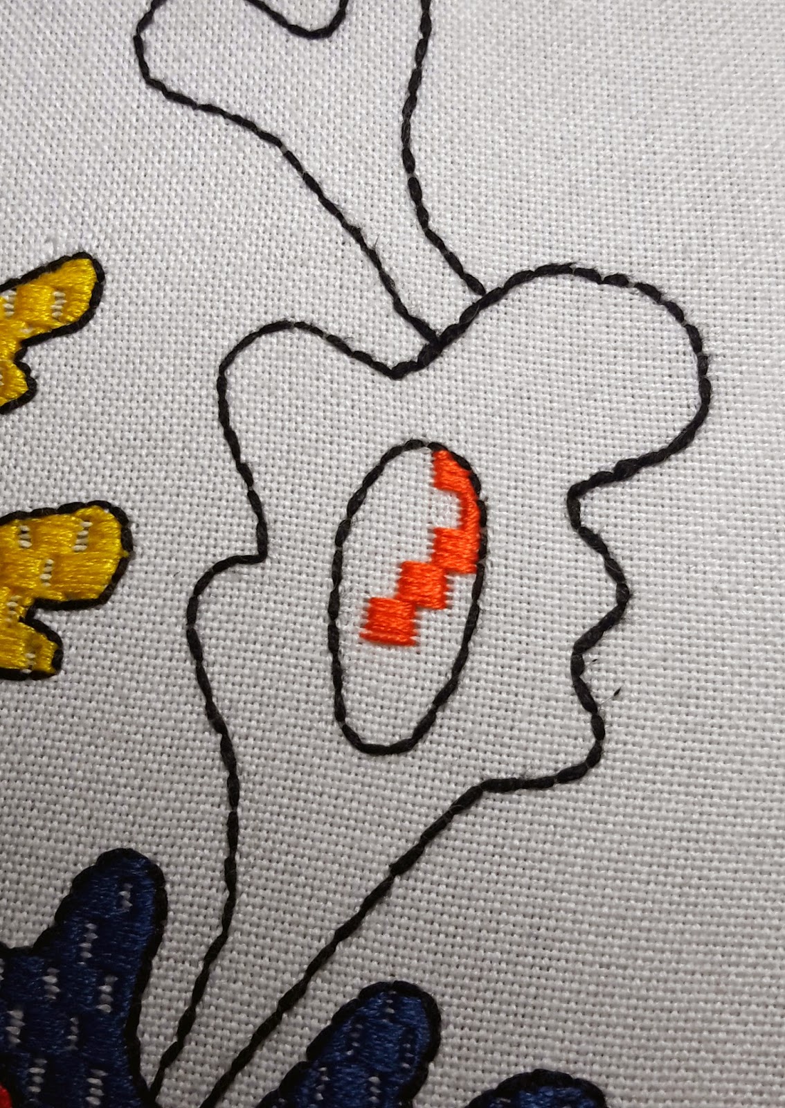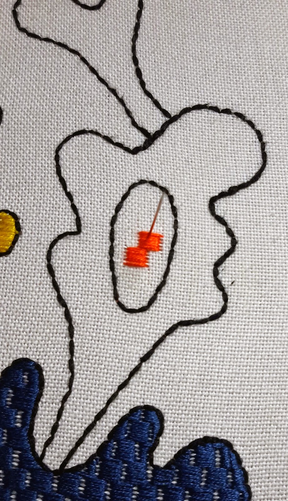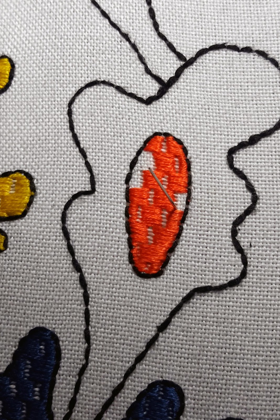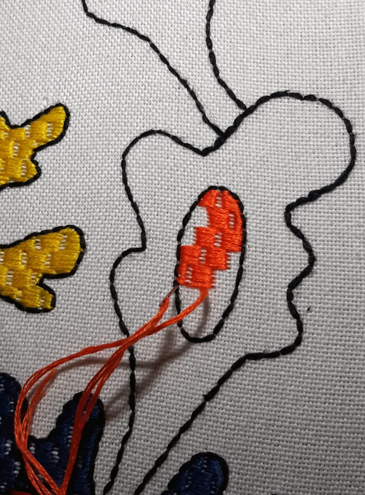 Теперь третий: мы видим,что третий кирпичик у нас возле контура,поэтому аккуратно его правую сторону заводим под черную нитку: