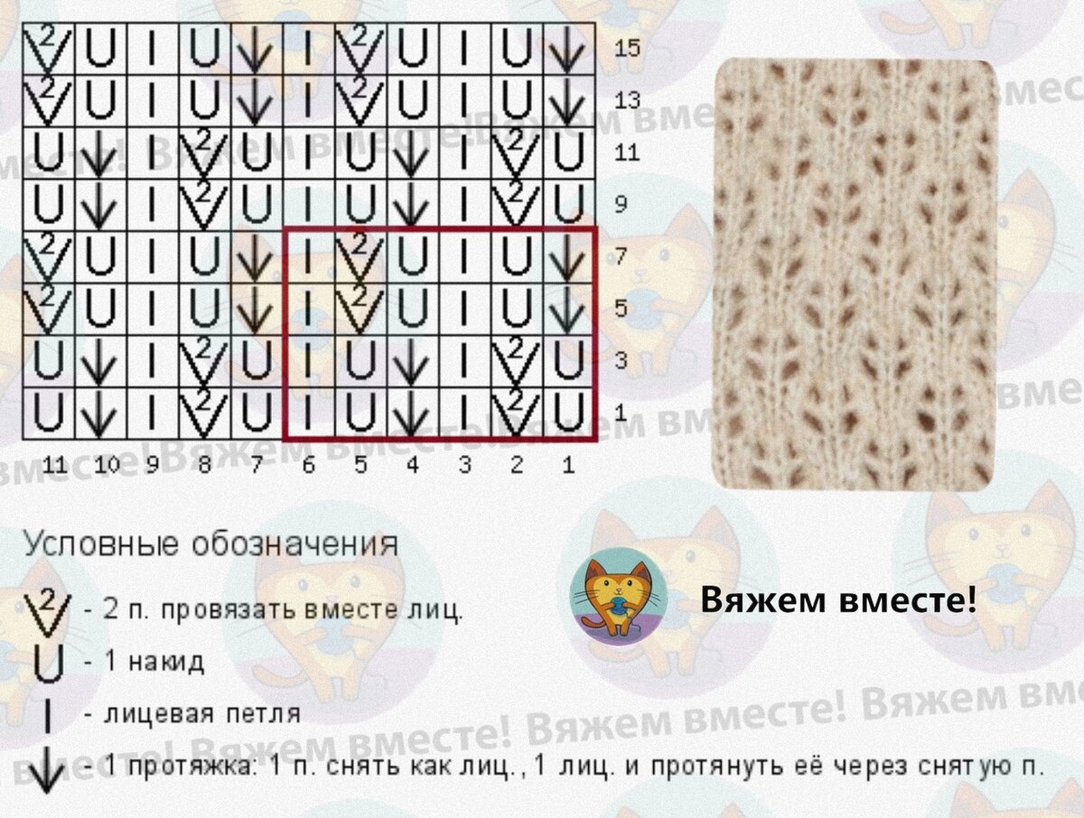 Раппорт ажурного мотива равен 6 петлям по ширине и 8 рядам по высоте, выделен красной рамкой на схеме.