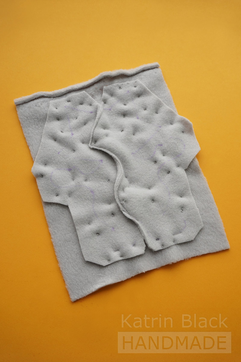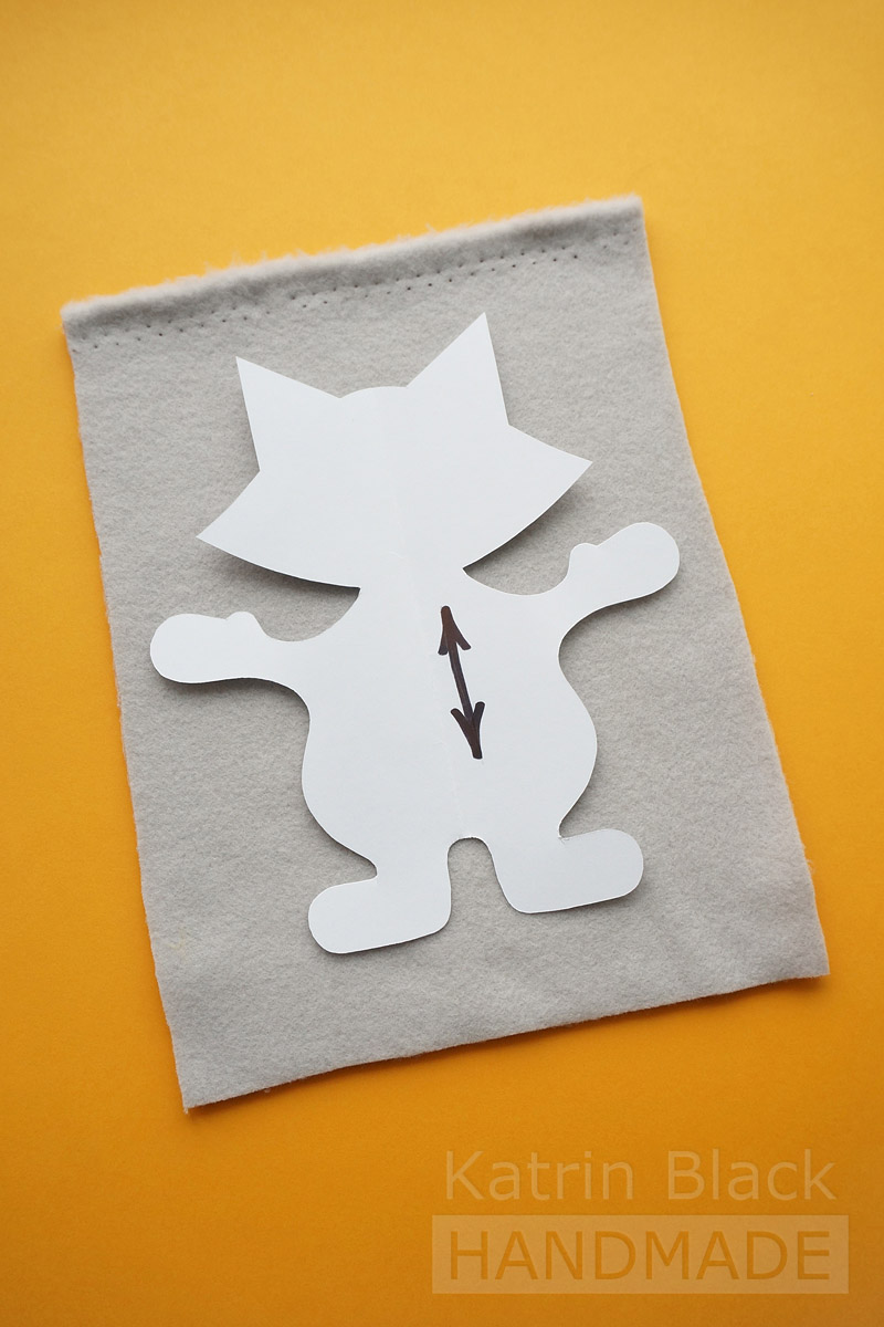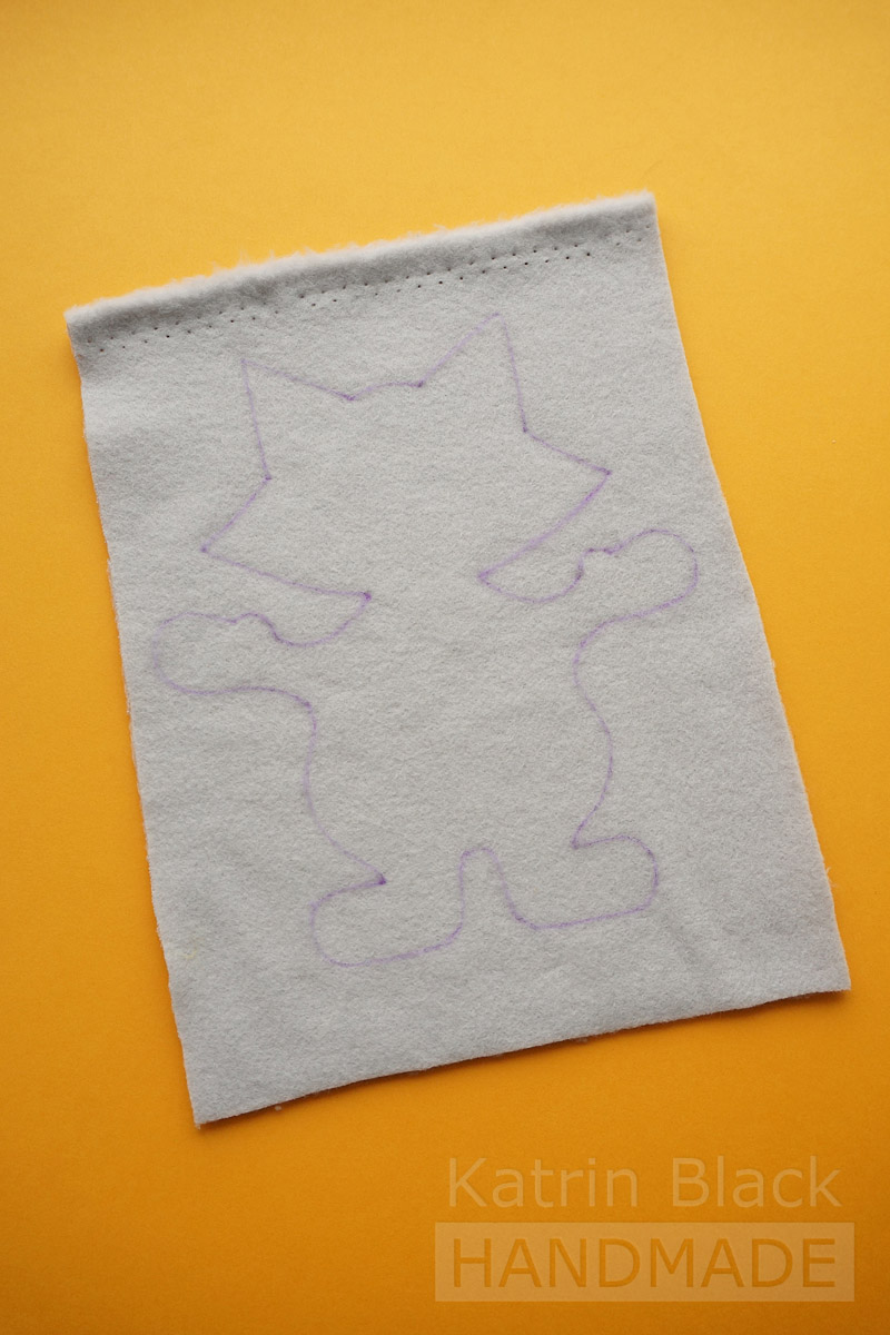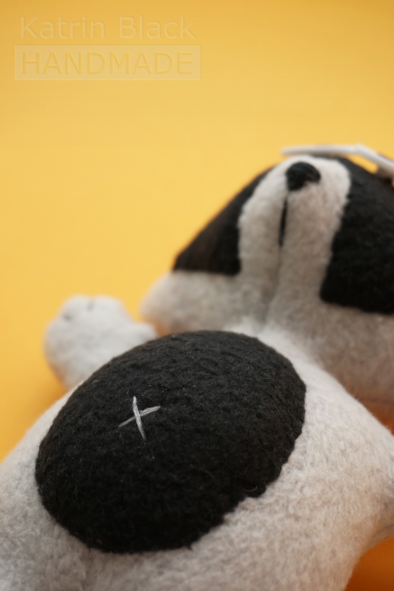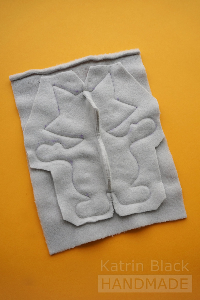 9. Вырезаем чёрные аппликации на животик и мордочку. Прикалываем булавками и аккуратно пришиваем швом через край.