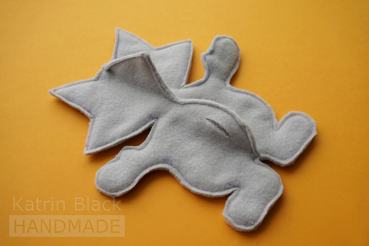 5. Отрезаем лишнюю ткань, оставляя припуск 2-3 мм. Прорезаем флис в углах (между ног и под головой) почти до шва, чтобы на игрушке потом не появилось перетяжек.