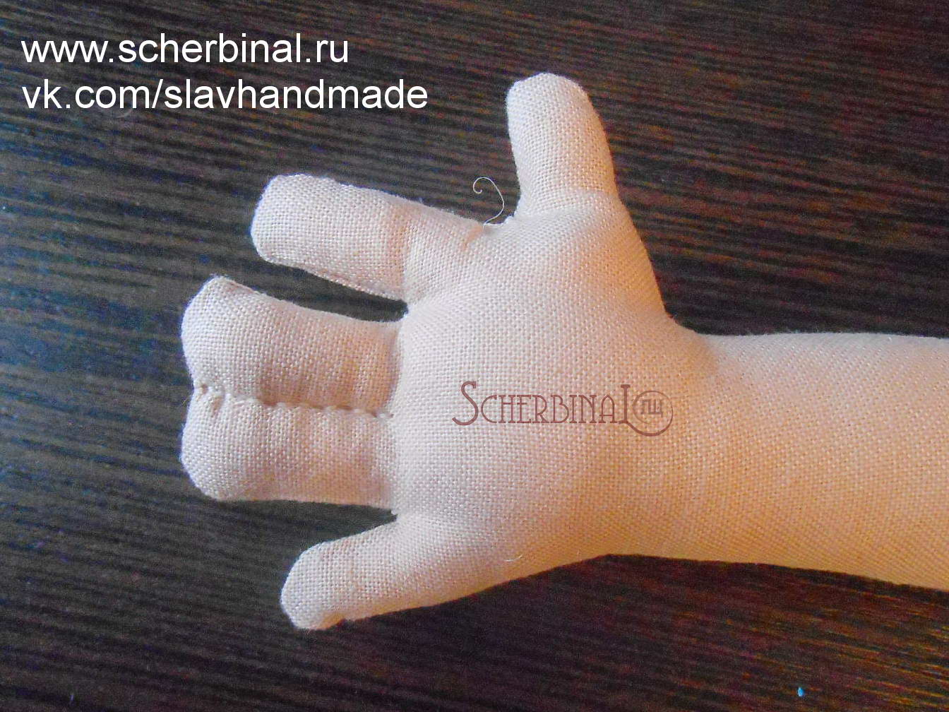 Теперь пришиваем руки к туловищу. Не забудьте, что большие пальцы рук смотрят вперёд!