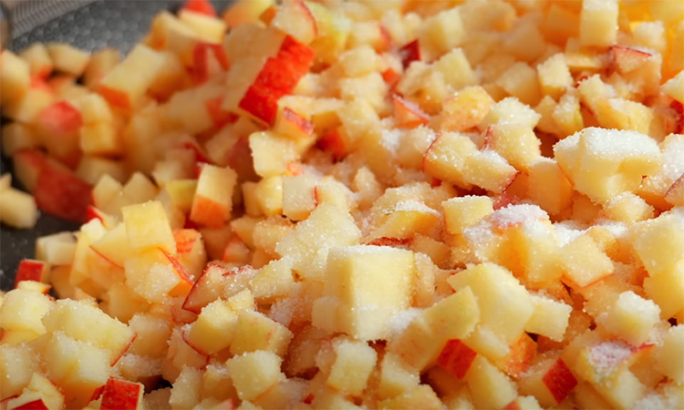 Яблоки тщательно вымойте и при необходимости очистите от кожуры, если хотите более нежную текстуру начинки. Нарежьте их небольшими кубиками. В сковороде растопите сливочное масло, выложите яблоки, добавьте сахар и, по желанию, немного лимонного сока. Всыпьте корицу. Перемешайте и обжаривайте яблоки на среднем огне около 15 минут, пока они не станут мягкими и не уменьшатся в объеме. Начинку снимите с огня и оставьте остывать до комнатной температуры.