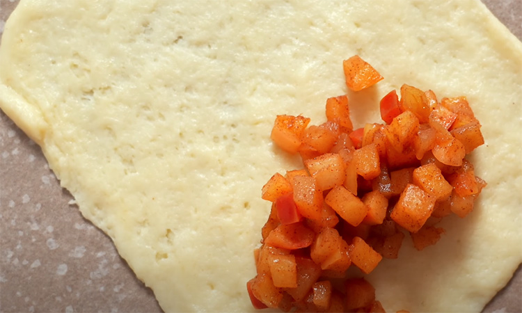 Разделите массу на 8 равных частей весом около 50 г каждая. Скатайте кусочки в шарики и слегка расплющите. В центр каждой заготовки положите 3 чайные ложки яблочной начинки.