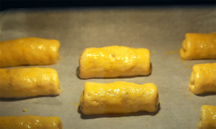 Аккуратно соберите края теста и защипните, формируя пирожок. Выложите пирожки на противень, застеленный пергаментной бумагой. Для румяной поверхности смешайте желток с молоком и смажьте пирожки сверху.