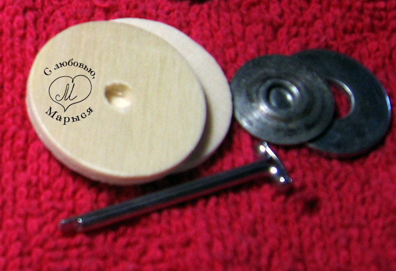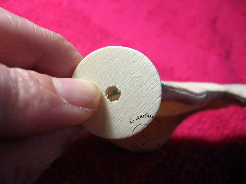Острыми маникюрными ножницами, просунув их внутрь детали и проведя в отверстия шайбы и диска проделываем отверстие для шплинта. Обращаю ваше внимание, диск должен находится между тканью и защитной шайбой.