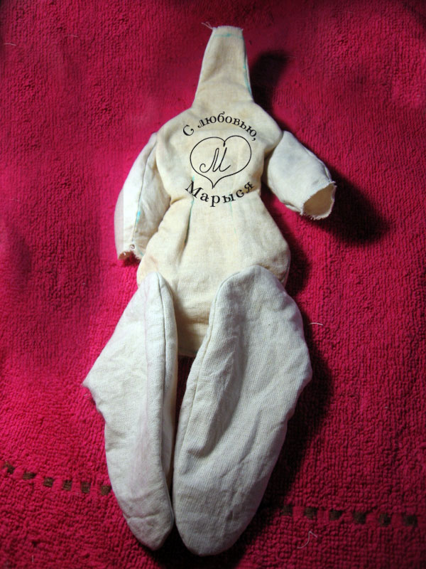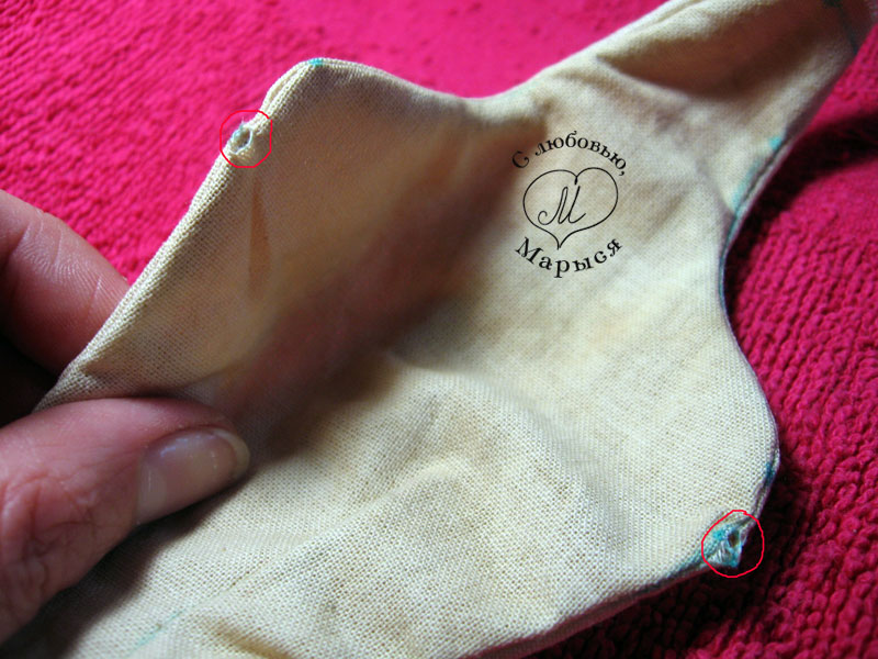 Нам нужно понять, где крепить руки. Для этого берём тело, складываем вдоль, совмещая боковые швы. На плечах в самых широких местах ставим метку на оба бока сразу. На фото эти места обведены красными корявыми линиями.