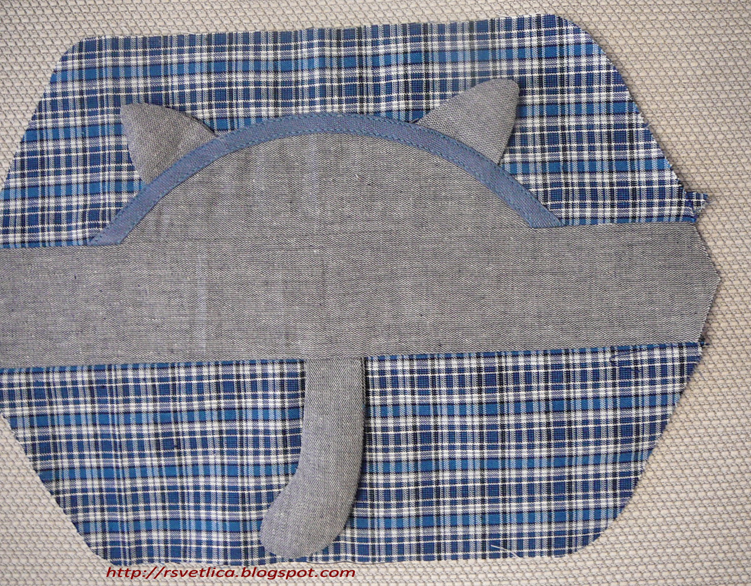 4. Ушки сшила, набила слегка синтепоном приколола к мордочке и все вместе пришила к другому боку пенала по краю косой бейки