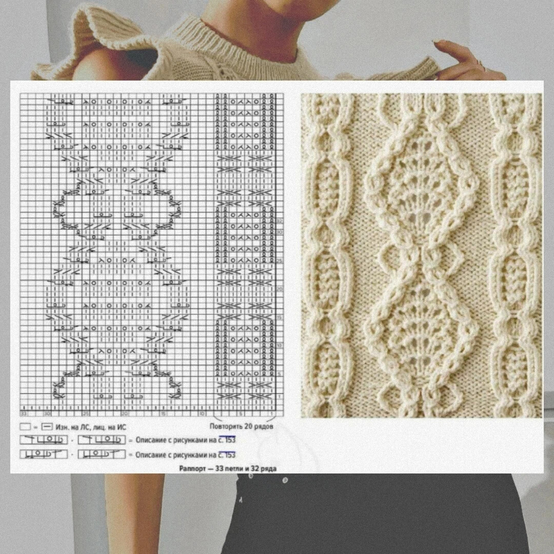 Если придираться, то узор на безрукавке и узор из сборника несколько отличаются по высоте и ширине раппорта. Отличаются окантовкой ромбов (в безрукавке самые простые косы, вяжутся даже проще оригинала) и количеством накидов в узоре внутри ромбов (в безрукавке третья строчка ажура состоит из 6 дырочек) и т.д.
