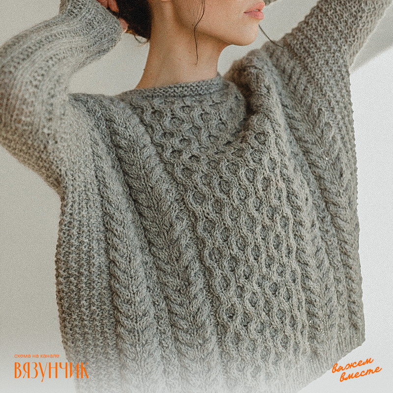 Очень простая модель с красивыми узорами. Мне рисунок напомнил пшеничные колоски в поле. Вот такая интересная ассоциация. Джемпер связан из смеси альпака и шерсти пополам. Толщина пряжи — 110м/50г. Издалека орнамент выглядит довольно сложным, однако при ближайшем рассмотрении, все встаёт на свои места.