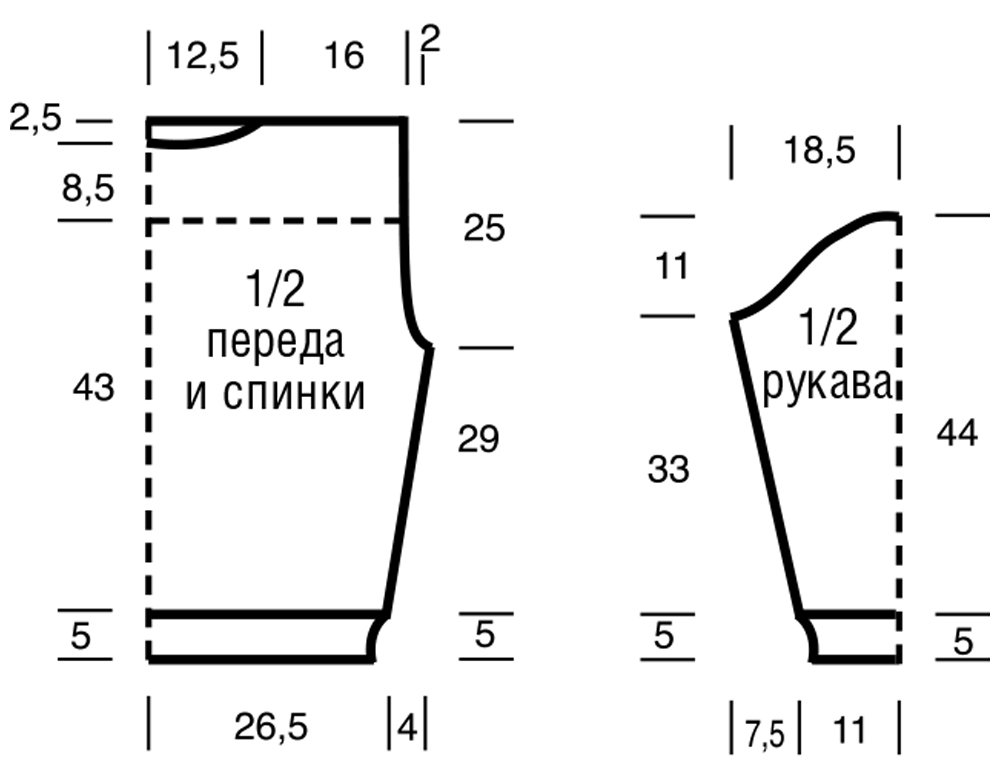 Для скругления по внутреннему краю закрыть в каждом 2-м ряду 1 x 5 п. и 1 x 3 п. На высоте спинки закрыть оставшиеся по 35 п. плеч.