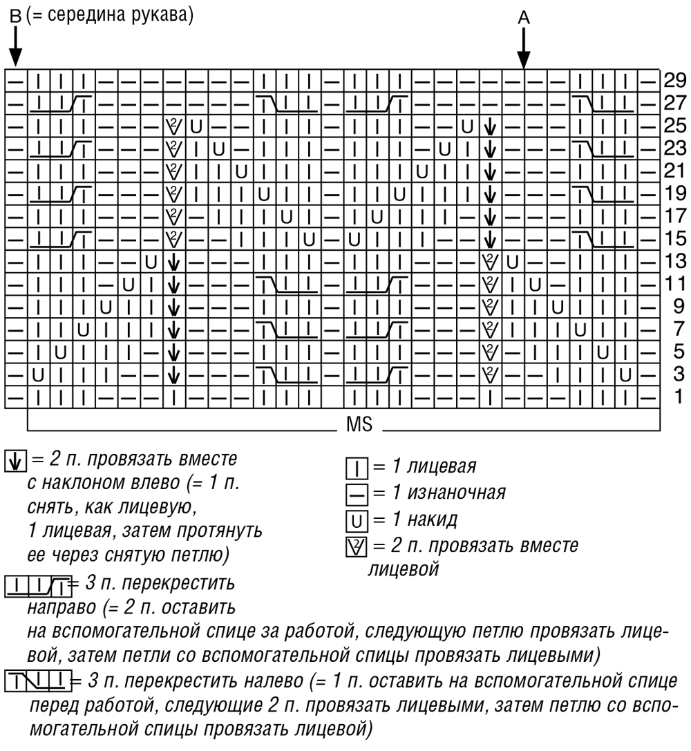 Продолжить работу на спицах №5 узором из «кос», при этом узор распределить от середины. Для этого начать с 1 кромочной и петель от стрелки A, вязать до стрелки B (= середина рукава), затем закончить узор в зеркальном отображении.