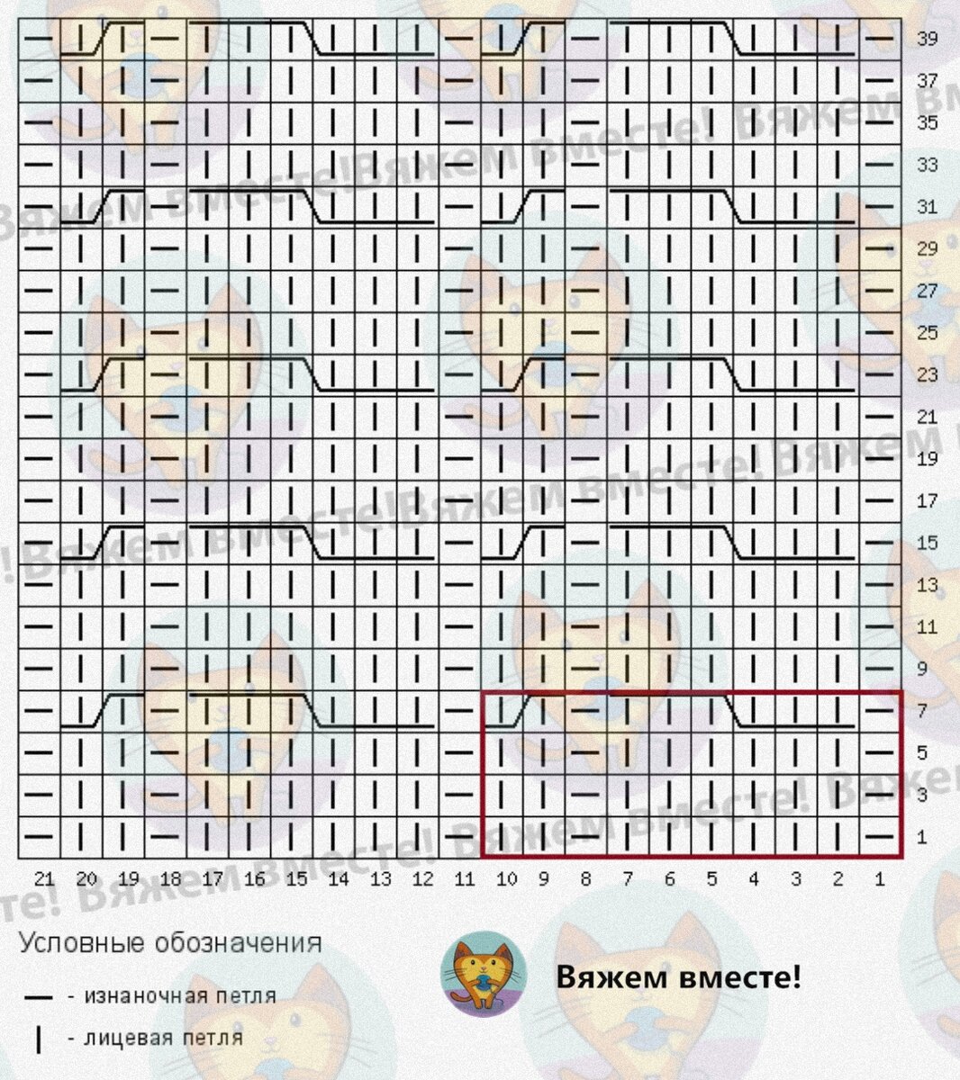 Раппорт узора составляет 10 петель по ширине и 8 рядов по высоте.