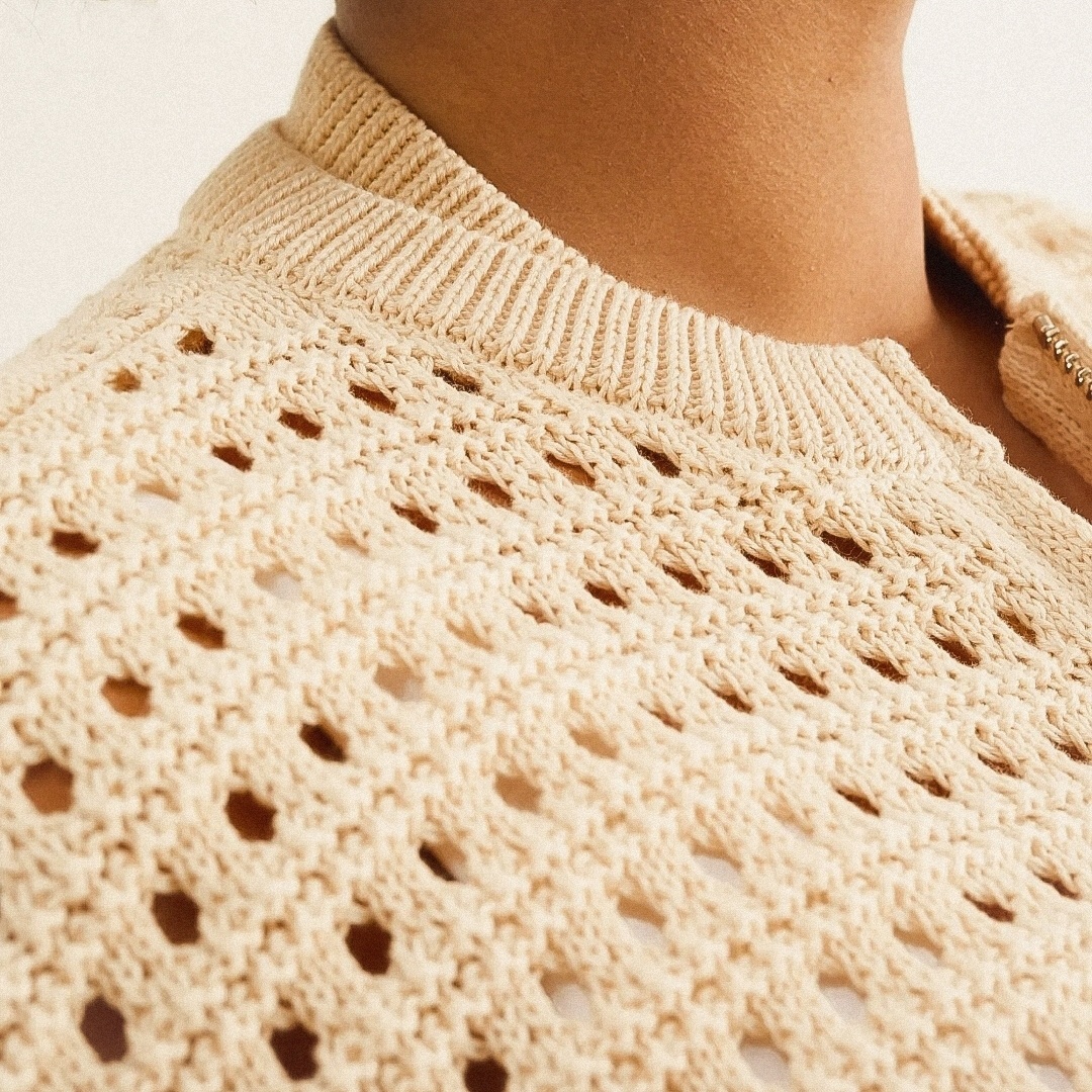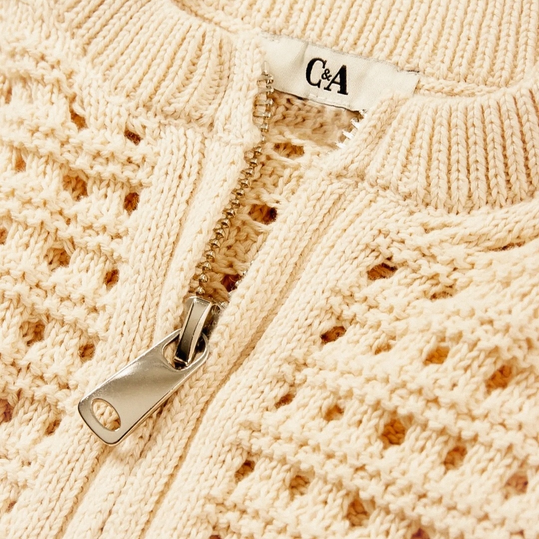 Особенность данного кардигана заключается в его узоре. Узор состоит из деликатной ажурной сетки с небольшими дырочками и рельефными горизонталями, расположенными по всей площади полотна.