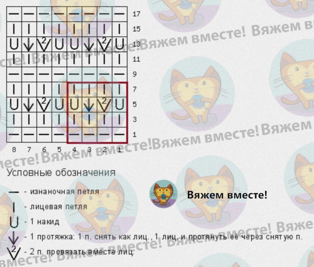 Раппорт узора равен 4 петлям по ширине полотна и 8 рядам по высоте.
