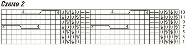 УЗОР ИЗ "КОС" (ПЕРВОНАЧАЛЬНО НА 21 П.): вязать по приведенной схеме. На схеме даны только лицевые ряды. В изнаночных рядах петли провязывать по рисунку. В высоту выполнить 1 раз с 1-го по 14-й р., затем повторять с 3-го по 14-й р. После 1-го р. на спицах 24 петли.