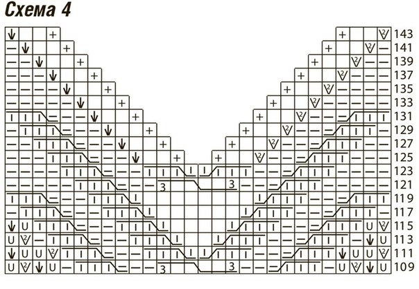 После последнего ряда схемы выполнить по краю горловины в каждом 2-м ряду еще 10 x 1 убавку и в каждом 4-м ряду 1 (2) 3 x 1 убавку аналогично.