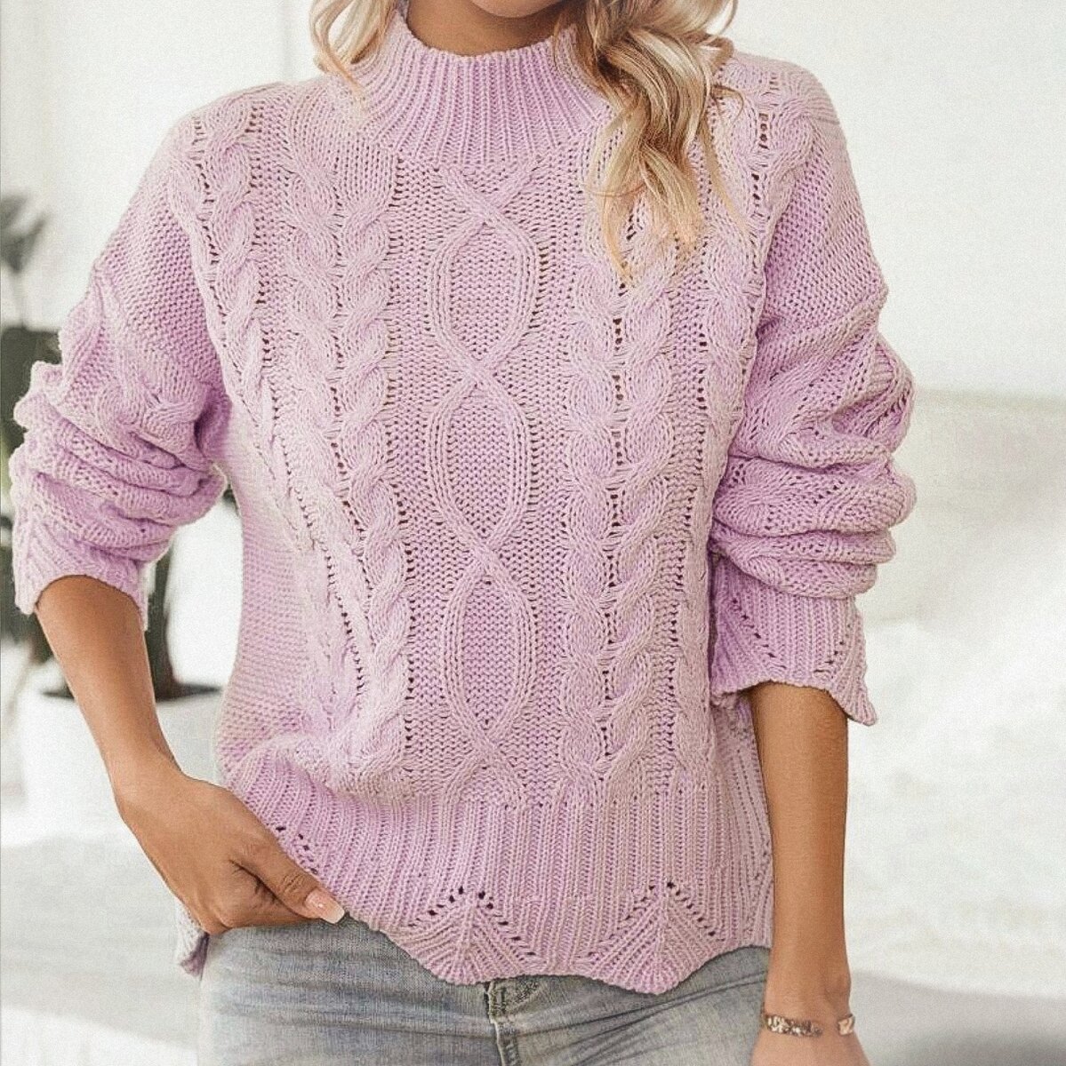 И последняя на сегодня модель — симпатичный сиреневый джемпер, украшенный переплетениями и жгутами.
