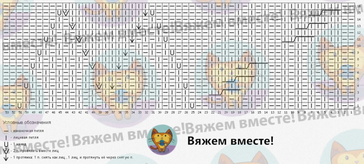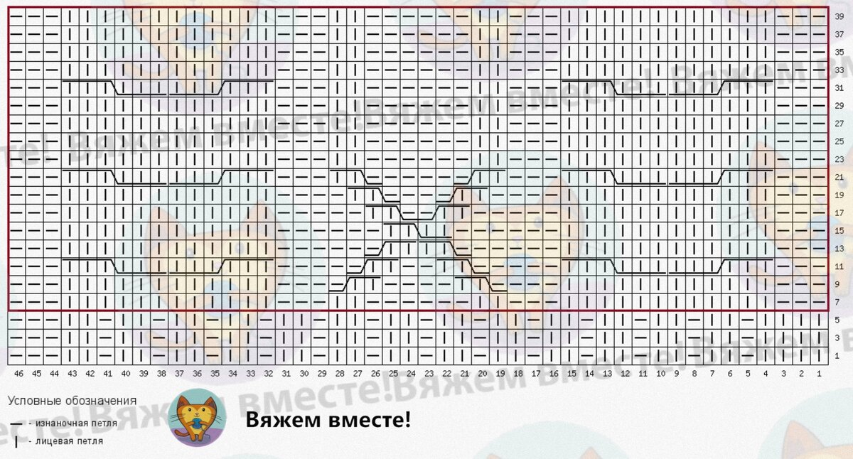 На схеме обозначены только лицевые ряды вязания, изнаночные вяжутся по рисунку петель на спице.