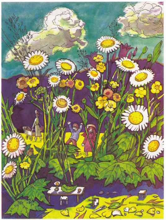 Лютики и другие цветы теперь едва доходили детям до колен, а не раскидывали свои ветви у них над головами. Мимо, жужжа, пролетел шмель. Он был вполне обычных размеров. Муха, сидящая на колокольчике, тоже казалась обычной мухой. Только муравья не было видно: наверное, он спрятался под травинку.