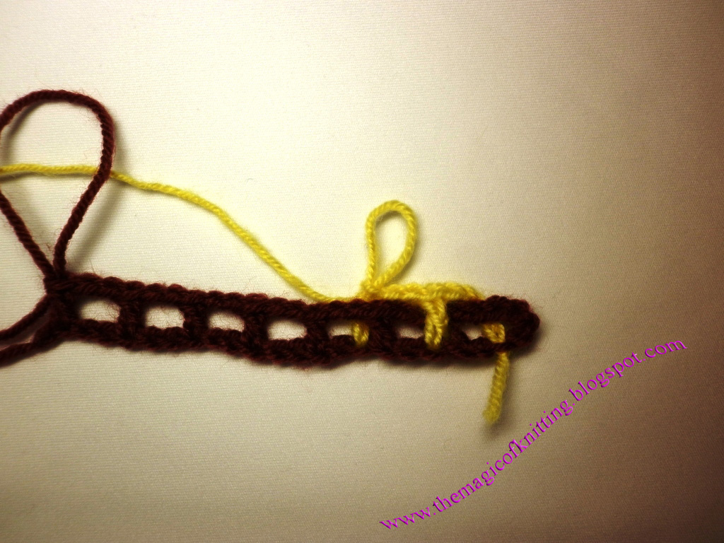 Оставляем желтенькую, вяжем снова бордовой. Столбики вводим в столбики предыдущего ряда этого же цвета то спереди, то сзади:
