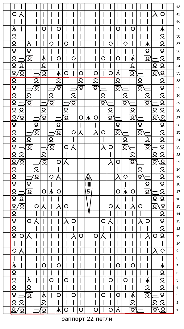 Раппорт узора 22 петли в ширину +1 (голубая клеточка) для симметрии. В высоту повторяем с 1-го по 28 ряд.